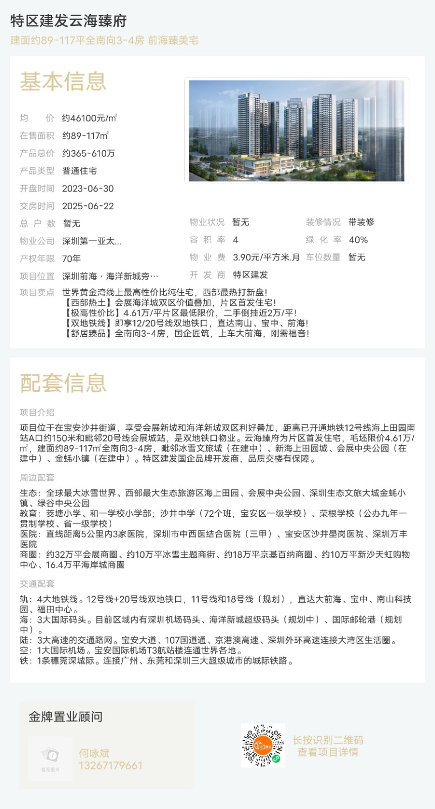 樓盤:特區建發云海臻府物業類型:普通住宅戶型:3室、4室面積:約89-117平米總價:約365-610萬聯系人:何詠斌聯系電話:13267179661
