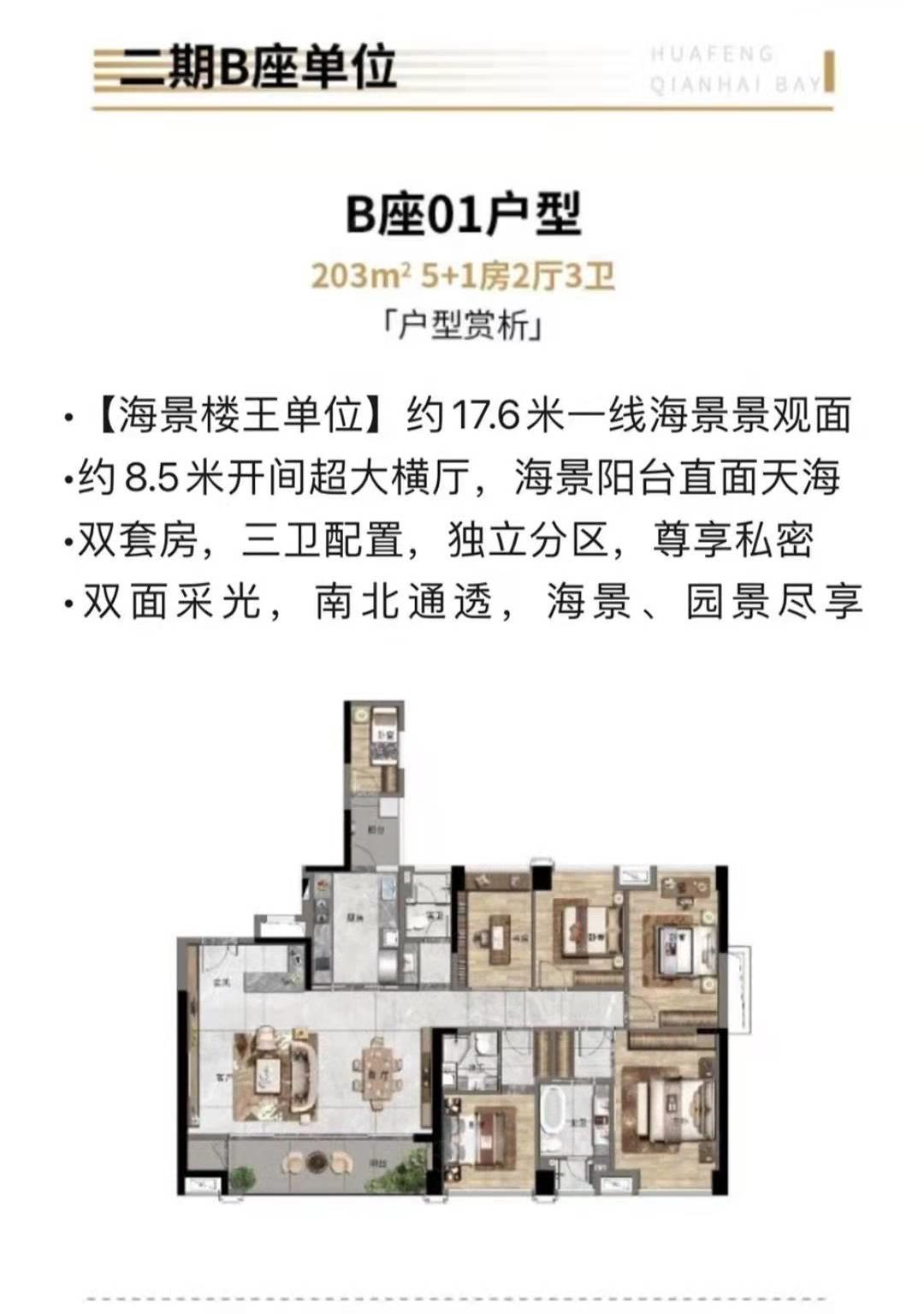 樓盤:華豐前海灣物業類型:公寓戶型:3室、4室、6室面積:約121-203平米總價:約880-1600萬聯系人:何詠斌聯系電話:13267179661
